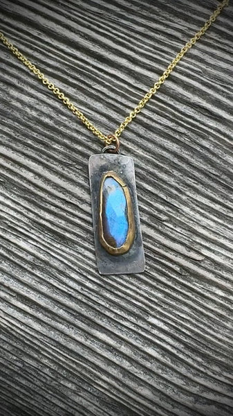 Hand hewn Rosecut Labradorite in a 22k yellow gold setting on a sterling silver seat featuring antique relic texture.